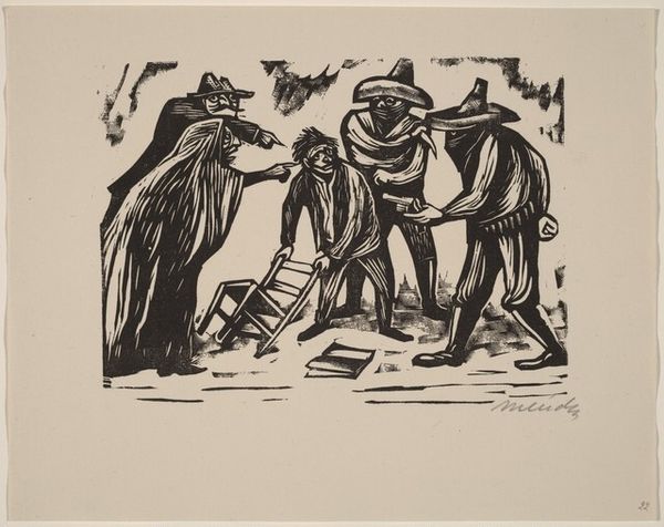 Editor: This is "Fascism I" by Leopoldo Méndez, created in 1943. It's a powerful woodcut print, and honestly, it's pretty chilling. The stark black and white imagery and violent scenes really get to you. How do you interpret this work, especially in its historical context? Curator: The potency comes from the layering of symbols. The immediate depiction of brutality reflects the explicit violence of fascism. But consider the visual weight placed on the faceless firing squad, the civilian victims, and the dominating figure adorned with the swastika. Doesn't that iconic representation attempt to freeze a universal essence of the oppressive regime? How does the artist use visual language to translate a complex ideology? Editor: That’s a great point about the figures, almost dehumanized to represent systems of power. So, it’s less about specific people and more about representing an idea of power and those it victimizes? Curator: Precisely. And woodcut, as a medium, inherently carries symbolic meaning, doesn't it? Its history is intertwined with disseminating messages, particularly during times of social and political upheaval. Méndez harnesses this cultural memory, embedding the work within a longer lineage of resistance art. What impact does that awareness of past struggles and symbolism have on a contemporary audience viewing this today? Editor: It gives it an enduring relevance, I think. It becomes a symbol not just of that time, but of any time when similar oppressive forces arise. Thanks for your insight. I see so much more now. Curator: Indeed. It speaks volumes about cultural memory and the responsibility of images to provoke remembrance.