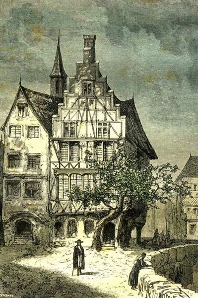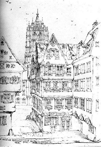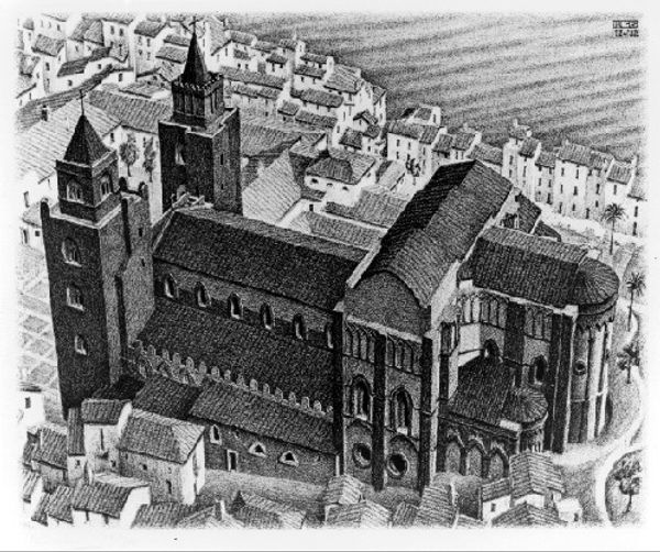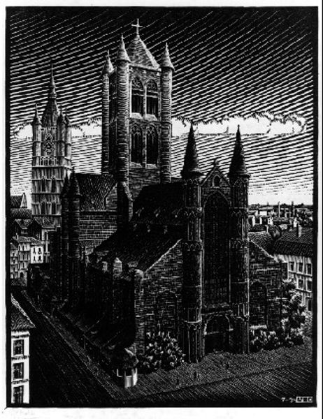 Curator: Look at the imposing Tournai Cathedral through the eyes of M.C. Escher. He crafted this view in August 1934 using woodcut. It's a striking cityscape, rendered in sharp black and white. Editor: Stark is the word that comes to mind. The sharp contrast and intricate detail create a rather haunting feeling. It’s both beautiful and unsettling at the same time. Curator: Escher was deeply interested in tessellations and mathematical patterns, something we see evidence of here in his very deliberate architectural depiction. His exploration of space is a clear nod to the rise of Modernism at the time. But look at the position he took—the average resident's view is dominated by the cathedral. Editor: Absolutely. The towering cathedral almost bears down on the tightly packed houses below. The sharp, upward thrusting spires suggest a spiritual striving, but they also read as rather intimidating symbols of institutional power. This tension—faith versus daily life, aspiration versus oppression—permeates the work. The cross atop each tower piercing the sky reinforces it. Curator: The vantage point Escher chooses here creates a hierarchical landscape, something that I’m certain would not be unintentional. Escher spent much of his time traveling through Europe capturing townscapes like this one. There are obvious connections with the printmaking traditions from the North. Editor: You can certainly feel echoes of Dürer and other printmakers. But Escher infuses his print with a distinct, almost dreamlike, quality. The strict geometry, balanced with more organic rooftops feels surreal. Even the sky is unusual. Curator: Note also the density and flatness, so characteristic of woodcuts. Escher certainly takes an unusual interest in how different perspectives come together on a flat plane, disrupting typical representational strategies. Editor: It certainly makes one contemplate not just the architectural forms, but the very nature of belief, social structure, and even how we perceive reality itself. Curator: The cultural symbolism combined with unique perspective—Escher's lens brings the powerful Cathedral into conversation with the people who it watches over. Editor: Leaving me pondering on the legacy and lasting implications of faith and its physical manifestations in our daily lives.