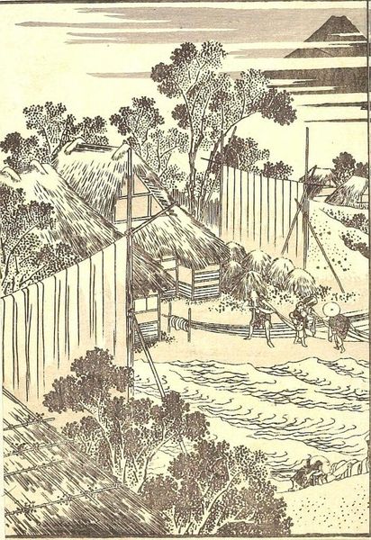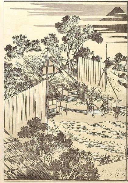 Editor: Here we have Hokusai's "Fuji through Flowers," a woodblock print from his "One Hundred Views of Mount Fuji." I'm struck by the contrast between the bustling scene of daily life and the serene, almost dreamlike, depiction of Mount Fuji in the background. What's your interpretation of this contrast? Curator: Hokusai was very deliberate in portraying the ordinary alongside the iconic. Consider the social context: these prints were affordable, mass-produced images for a burgeoning merchant class. By framing Fuji through everyday activities, like the gathering under the blossoming tree, Hokusai democratizes the symbol of Japan, bringing it into the lives of common people. How does this democratization of imagery influence its cultural significance, do you think? Editor: That's interesting! I hadn’t thought about it that way. It makes the mountain seem less like an untouchable symbol and more a part of everyday life. Curator: Exactly. And it highlights the power of art to shape and reflect social change. It makes me wonder how artists today are democratizing iconic imagery.