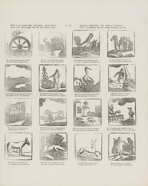 This undated print, "Vertoont u kindren deze print," was created by Erve Wijsmuller, presenting a world neatly divided by labor and social expectation. Each small scene depicts a different occupation, visually laying out how each person earns their living. The print reflects the societal values of its time, likely the 18th or 19th century, emphasizing the importance of diligence and adherence to one's prescribed role. The composition invites a dialogue about labor, class, and the social contract. How are our identities shaped by our work? How do these roles reinforce or challenge societal structures? Each figure, caught in their daily tasks, prompts us to consider the dignity—or lack thereof—assigned to various forms of labor. It is a mirror reflecting the economic and moral frameworks of its time, subtly questioning who benefits from this structured world and at what cost? The print serves as a historical document and an ongoing conversation about the values we project onto work and worth.