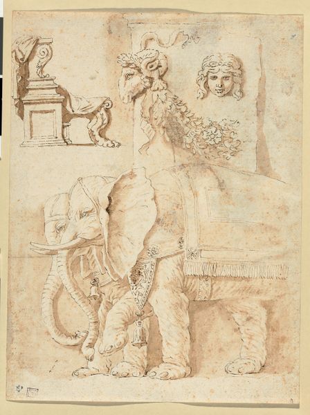 Curator: Take a look at this fascinating piece titled, "Designs for Ornamental Motifs and for a Herm Supporting a Chimney Piece" created sometime between 1568 and 1625, possibly by Guglielmo Caccia, also known as Moncalvo. It's currently held at the Metropolitan Museum of Art. Editor: Oh, I immediately get a sense of grandiosity from it! The swirls and flourishes feel theatrical, almost demanding to be noticed. It's got this unfinished quality to it, though, that keeps it from feeling overly stuffy. Curator: Right, let's dive into the world it evokes. Ornamentation during this period—late Renaissance and early Baroque—played a huge role in reflecting power and social standing. Think about these motifs within the context of architectural and social aspirations, these patterns symbolized wealth and authority in aristocratic circles. How might these designs play a role within such a rigid social system? Editor: I'm drawn to the physicality of the piece. It looks like a preparatory drawing, possibly with ink washes? You can almost feel the artist working out the construction and placement of each curl and acanthus leaf. It's also interesting to think about who was producing this labor. Craftspeople, often anonymous, were responsible for translating these designs into actual physical objects, creating real status symbols from drawings like these. Curator: Exactly! Considering who was excluded from this elevated class helps contextualize these drawings as tools for social inequity. Whose labor was sacrificed, unacknowledged, for its production? And for what purpose? The elaborate designs became an ostentatious distraction, shifting focus from the struggles of everyday life and towards an idealized, unrealistic existence. Editor: And it’s precisely this that complicates things. We are seduced by beauty and masterful handling of the medium, all while becoming aware of the designs’ socio-historical purpose. One question: did Caccia, a painter, generate such ornamental ideas himself or did he hire workshop draftsmen to fill those preparatory sheets with such embellishments and possible chimera? Curator: Well, that opens up many questions regarding the authorship. But returning to my original intention, these drawings give us a critical lens through which to consider power structures embedded in artistic traditions. Editor: Yes, understanding the material production of these ornaments, coupled with the historical forces behind their use, lets us examine these designs as commodities within their complex social settings. Thanks! Curator: Indeed, let's both remember this exchange the next time we visit an estate with elaborate, period interiors.
