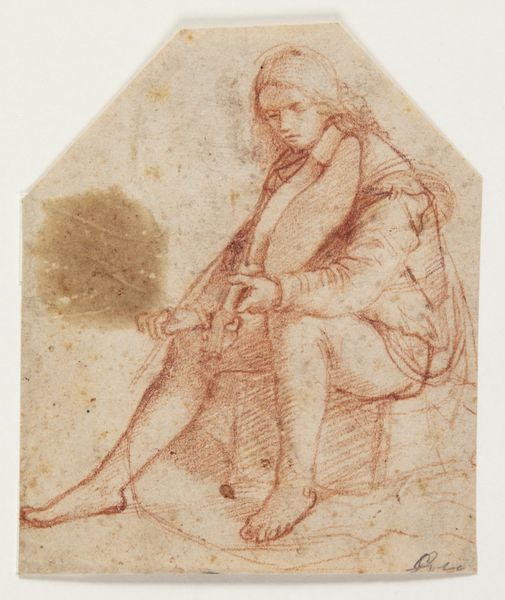 Curator: Here we have Rembrandt van Rijn's delicate drawing, "Kneeling Actor," which captures a figure in quiet contemplation. The sketch is small, only a few inches square. It exudes a sense of intimacy. Editor: It's a tender, almost vulnerable portrayal. I'm struck by the lines that seem to suggest a weight of emotion. Curator: Rembrandt's process is fascinating here; the economy of line, the use of humble materials like brown ink, all speaks to a practice deeply rooted in observation and draftsmanship. Editor: Absolutely. And considering the historical context, theater, especially the Commedia dell'arte, played a vital role in social critique. Is this actor embodying a certain character or class struggle? Curator: Perhaps. Rembrandt was definitely interested in capturing the human condition, and that includes the labor and performance involved in societal roles. Editor: The actor's posture, the way he holds his hands, it all conveys a sense of someone caught between performance and reality, which resonates even today. Curator: A powerful reminder that even quick sketches can offer profound insights into the complex relationship between art, labor, and human expression. Editor: Indeed, it really does make you wonder about the figure’s narrative and place in the world.