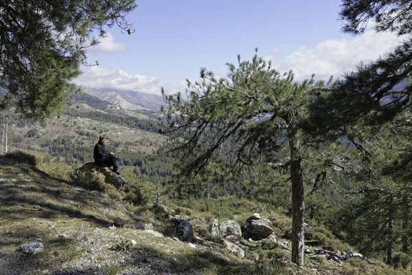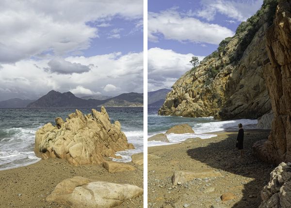 Curator: This is "Tombeau Imaginaire 8," a 2019 photograph by Elina Brotherus. The work features a lone figure amidst a majestic mountain landscape, split into two frames. Editor: Immediately, I'm struck by the composition; the diptych form creates a powerful, almost geological sense of depth. The somber tone of the figure’s attire juxtaposes so strongly against the expanse of nature. Curator: That contrast is key. Brotherus is often examining the interaction between human presence and the raw materiality of the landscape. How do we locate ourselves, physically and conceptually, within these spaces? What materials does she chose and what are their origins? These are central questions for Brotherus' work in general. Editor: Indeed. The lone figure, shrouded in a long, dark coat, could represent anyone or perhaps everyone. Their back is turned, almost inviting us to consider our own place within this vista. The symbolism feels loaded; the mountains acting almost as sentinels. It conjures themes of introspection and maybe even confrontation with the immensity of existence. Curator: It's interesting how you frame that. The coat itself is a crafted object, offering a layer of protection against the elements, a social construct against the environmental. It's an intervention. Brotherus isn't merely observing. The method is also important. Editor: It invites consideration: the two frames side by side emphasize a fracture, a separation. Perhaps a reflection on different aspects of self or existence? Mountains, as potent symbols, often mean different things in varying cultures: strength, steadfastness, spirituality... Curator: Yes, there is much to digest regarding the cultural significance of landscape in art itself. As much as the land represents opportunity it is the backdrop for so many stories about cultural upheaval and our endless attempts to extract value from it. Editor: Precisely. It brings forward those ingrained narratives we all share. And how clever of Brotherus to frame this contemplation in this diptych structure, to literally separate it for the viewer. Curator: It prompts an interrogation into where we’ve come from and how we position ourselves within it. Editor: Ultimately, it encourages me to consider what is meant by our relationship to the enduring imagery around us and the emotional weight that has been placed on them. Curator: A fruitful investigation through image and intervention indeed.