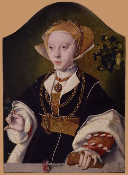 Jean Bellegambe painted "Saint Barbara" around 1520, rendering the figure on a vertical wood panel with oil. The painting’s composition focuses on Saint Barbara, her figure framed by architectural elements, which draws our eyes upwards. The lines are crisp, defining forms with precision, while the colour palette is rich with reds, greens, and golds. The architectural space is constructed with careful attention to proportion and balance, yet the perspective feels somewhat flattened, almost dreamlike. Bellegambe was working during a period of significant religious and social change. His portrayal of Saint Barbara combines traditional iconography with a contemporary, almost secular sensibility. The painting invites us to consider how established meanings of religious devotion were evolving through new ways of seeing and representing the world. Note how the artist's rendering of architectural and human forms destabilizes fixed categories, pushing the painting into a space of ongoing interpretation.