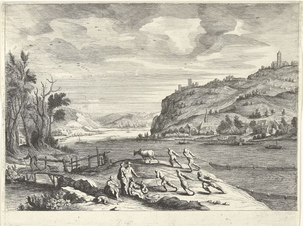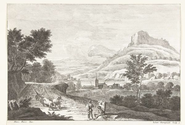 Curator: This is Pieter Nolpe's "Landscape," held here at the Harvard Art Museums. Editor: It feels like a stage setting, all delicate lines and muted tones. Very picturesque. Curator: Note the meticulous use of hatching and cross-hatching. Nolpe’s control over the etching process allows him to articulate depth and texture with remarkable precision. Editor: And consider how this image would have circulated. Prints like these democratized landscape views. Nolpe offered an idealized vision of the Dutch countryside, shaping perceptions of national identity. Curator: Ideals are embedded even in the formal structure: the interplay of light and shadow, the balance of the composition... It’s an elegant and ordered world. Editor: Indeed, a world carefully constructed for public consumption and the reinforcement of cultural values. Curator: Ultimately, a testament to Nolpe's technical skill. Editor: And the power of imagery in shaping cultural narratives.