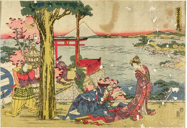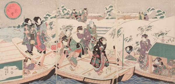 Curator: This woodblock print by Katsushika Hokusai is titled "Treasury of Loyal Retainers," and it captures a pivotal moment. Editor: It's visually striking. I'm immediately drawn to the contrast between the serene, snow-covered landscape visible through the open doorway, and the tense scene unfolding indoors. Curator: The print depicts a scene from the Chushingura story, a narrative deeply embedded in Japanese culture, revolving around themes of honor, revenge, and sacrifice. Hokusai uses it to explore the feudal system's impact. Editor: Note the textures and the layering of fabrics. Hokusai clearly wants us to understand the value embedded in this material culture and the social status it conveys. Curator: Absolutely. It also serves as a powerful visual statement about loyalty. The figures are caught in a web of social obligation and rigid moral codes. Editor: Thinking about the printmaking process, each line, each color, carefully planned and executed to convey not just an image, but a complex interplay of materials, meaning, and cultural context. Curator: The print really encapsulates the complexities of cultural narratives and personal expression, making it a rich piece of cultural commentary. Editor: Yes, and on a practical level, it makes me appreciate the skill involved in producing something so evocative using relatively simple materials.