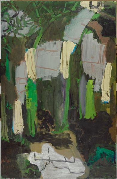 Editor: This is "A street in Naples: a market," an oil painting from 1965 by Mariam Aslamazian. The texture looks really thick. What grabs my attention is how the laundry lines compete with the market stalls. What do you see when you look at this work? Curator: The eye is indeed drawn to the tension between the domestic and the commercial spheres. Note how Aslamazian employs short, broken brushstrokes—a hallmark of Impressionism—to depict both the hanging laundry and the bustling market scene below. The composition itself is divided into distinct planes: the dark vertical shaft suggesting architectural framing, the chaotic mid-ground of laundry, and the compressed space of the market. Editor: So you are focused on the visual language itself, the brushstrokes, and the arrangement. Does the subject matter contribute at all to its interpretation? Curator: Subject matter serves merely as a pretext. The painting's core lies in the artist's exploration of form and color. Consider how the limited palette of muted reds, whites, and blues creates a sense of unity despite the disparate elements within the composition. The lines of washing repeat forms found in the stalls, mirroring the urban existence across various axes. Do you see how the geometry here flattens the scene, denying any atmospheric perspective? Editor: I see that now! The lack of depth really pushes the shapes and colors forward. It’s less about Naples, and more about…paint. Curator: Precisely! It is Aslamazian's formal manipulation of the medium, the deliberate flattening and fracturing of space that becomes the focal point. The essence here resides in the pictorial construction itself. Editor: It's interesting to consider how the seemingly everyday scene is almost secondary to the pure artistic experimentation. I appreciate that, in essence, the forms themselves become the subject.