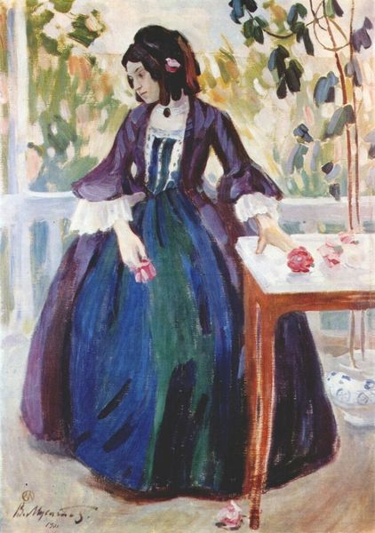 Editor: Here we have Korovin's "On the Terrace," an oil painting from 1920. It feels a bit melancholic, with those deep shadows. What symbolic weight do you think the terrace setting carries here? Curator: The terrace, often a liminal space between inside and outside, takes on multiple symbolic layers. In this work, and broadly across visual culture, terraces invite contemplation of what’s publicly performed versus what’s privately felt. It raises questions of cultural memory and continuity. Does the terrace connect with an actual place in the artist's memory? Consider, also, the era: 1920. Post-war. Is this a remembrance of pre-war opulence? Editor: So the flowers and the fashionable women could be read as symbols of a lost, luxurious past? Curator: Precisely. Red, particularly the color of those roses, often speaks to passion, love, but also sacrifice, blood. The artist uses color to construct this scene of reflection and perhaps mourning. Look closely at the expressions - do they seem present and engaged, or lost in thought? Editor: Lost in thought, definitely. There's almost a sense of detachment, even alienation. They aren't connecting with each other. Curator: And what about the clothing? How do the stylistic choices relate to broader cultural trends of the era and the collective psychology around loss? Editor: Their garments do feel like echoes of earlier styles. Perhaps representing an unwillingness to fully embrace modernity. It’s like they are literally wearing the past. Curator: The painting uses symbolic images to build a representation of longing and how social trauma affects collective cultural expression. Now that we've taken a closer look, does this resonate differently with you? Editor: Absolutely. I see the work is a portrait of a cultural sentiment through symbolic choices and representation of color. Thanks for unveiling these symbolic components!