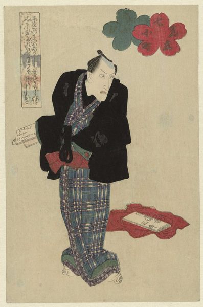 Editor: So, this is "Woman Reading a Letter," a woodblock print by Utagawa Kunisada from around 1825-1830. It's incredibly delicate, almost ethereal. The woman's expression is so intense; you can feel the weight of the message she's receiving. What do you see in this piece beyond the immediate narrative? Curator: Beyond the depicted narrative, I see echoes of societal expectations and constraints placed upon women in that era, primarily through subtle visual cues. The letter itself becomes a potent symbol, a carrier of news, perhaps controlling the woman's destiny or altering her emotional state. Editor: Do you think the cherry blossoms play any symbolic role, considering Japanese culture and their historical implications? Curator: Absolutely. Cherry blossoms, or Sakura, traditionally represent the ephemeral nature of life, beauty, and mortality. The inclusion of two, a red and a greyish blossom above the figure's head, speaks volumes about how emotions might be fleeting yet profound. This woman is caught in a moment, facing an emotional passage from the contents of her letter. Is she hopeful or forlorn, or maybe a bit of both? Editor: That's a fantastic observation; I didn’t consider the transient nature of emotion echoed in the blossoms. It certainly gives the artwork an entirely different depth. Curator: What intrigues me is that such works served as memory triggers within their specific society. By associating the female figure with a fleeting symbol, it spoke to the inevitability of fate. How fascinating is that the cherry blossom is one of the most consistent visual symbols through generations! Editor: It's incredible how much meaning can be layered into something that initially appears so simple. Thanks so much for shedding light on the underlying layers of symbolism at play in this print! Curator: Indeed. Exploring art is like uncovering memories of shared culture that shape our identities.