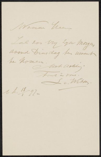 Curator: We are looking at a mixed media work on paper. Titled "Brief aan Philip Zilcken," this piece, believed to have been created around 1895 by Alphons Diepenbrock, utilizes both pen and ink in its creation. Editor: It looks like something lifted straight from a private journal. A glimpse into someone's thoughts—urgent, yet deeply intimate. It evokes a profound sense of empathy, don't you think? Curator: Absolutely. Diepenbrock’s identity as a composer is essential to consider when engaging with this piece. The use of language in his personal correspondence opens dialogues about societal mourning rituals within privileged social strata, and the very performance of grief as a sign of class. Editor: Right, I see what you mean. The careful script lends a weightiness to his condolences. I wonder what the story is—there's an energy here, a desire to connect despite distance. I imagine the texture of the paper beneath the nib. It grounds him—and us—in this fleeting expression. Curator: Consider that Diepenbrock also addressed significant portions of his output, as an intellectual, to the ongoing societal trauma generated in the aftermath of European colonialism, specifically the subjugation of the then Dutch East Indies. His art needs to be considered within a colonial framework. Editor: That reframes my response completely. What had felt tender, now reads as… performative? I'm wrestling now with authenticity. What is personal and what is a reiteration of status? Maybe that tension is the point. Art is at its most compelling when it shakes up how you see and feel the world. Curator: It challenges our expectations about not only art, but our understanding of gender, race and power in this historical context, and demands ongoing dialogue in order to more deeply unpack meaning. Editor: You know, looking at this piece… it actually ignites my need to rummage around and dig into my own journal. This idea of documenting the immediacy of an idea – the pure act of reaching out in any medium. I am suddenly so creatively energized. Thanks, Diepenbrock!