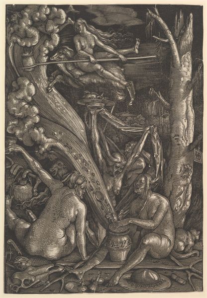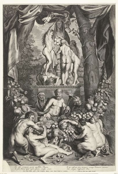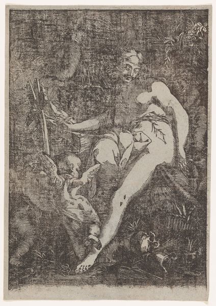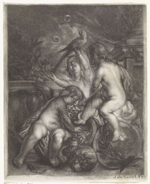 Editor: Here we have "Mars en Venus," an etching and engraving print made around 1683 by Willem de Ryck. It’s quite busy, isn’t it? It strikes me as both powerful and playful with all those little cherubs, despite the dramatic, almost chiaroscuro lighting. What do you make of this piece? Curator: Oh, this piece sings to me of passionate paradoxes! Look at Mars, the god of war, practically melting in Venus's embrace. It's the oldest story in the book, isn’t it, about love conquering all, even war. De Ryck seems to be poking a little fun, maybe saying that even the mightiest warrior is just putty in the hands of love… or a strategically placed goddess. What do you make of the overall composition? Editor: Well, the way everything's crammed together… it's almost claustrophobic! All those figures, and the heavy drapery. Does that cramped composition contribute to that feeling? Curator: Exactly! The artist is a trickster. It's no accident: all the elements of drama create tension between desire and reason, love and conflict. A dance as old as time. Do you see the cherubs playing with Mars' discarded armour? Delicious! A touch of lightness to keep the whole thing from getting too serious. That Cupid with his bow… mischief incarnate! Editor: Oh, that is cheeky! So it’s less of a straightforward depiction, and more of a commentary? Curator: Precisely! De Ryck is winking at us. Baroque art loved theatricality. It reminds me a little of Bernini's sculptures. What a reminder that artists play with archetypes across history to comment on universal truths! Editor: This print has completely transformed how I saw Baroque art: a witty dialogue, rather than mere pomp and circumstance. Thanks for unveiling new ways of looking at art. Curator: The pleasure was all mine! Every work is a universe waiting to be unlocked, I just happen to have the key – or think I do!
