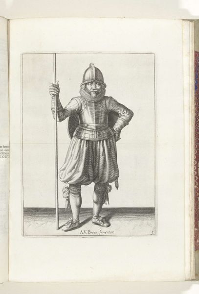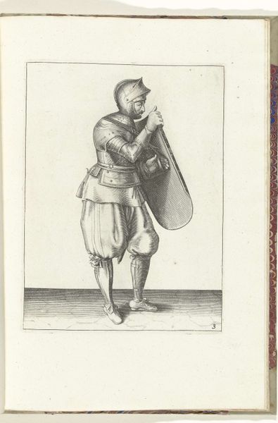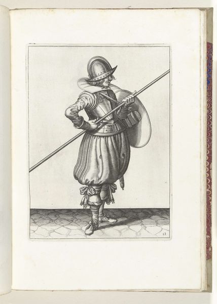 Editor: So, here we have "De exercitie met schild en spies: de soldaat brengt de spies met twee handen weer in positie (nr. 29)," made around 1616-1618 by Adam van Breen. It appears to be a pen and ink sketch of a soldier with a shield and spear. The figure is striking a pose mid-maneuver. What historical narrative do you see in this work? Curator: This piece, beyond just depicting a soldier, really speaks to the militarization of early modern Europe. We need to consider the Eighty Years' War as a backdrop – a struggle for Dutch independence from Spain. The very act of meticulously depicting this soldier suggests a preoccupation with order and control. Do you see any clues here about social hierarchies of the time? Editor: I see the way he's carefully dressed and armed suggests that this piece is more than just a simple sketch of military life. It presents an elevated ideal. What kind of relationship can we explore with gender, looking at weaponry of the time? Curator: Precisely! While warfare is often seen as a masculine domain, remember women were also deeply affected, often left vulnerable by these conflicts or sometimes even participating directly, disguised as men, facing societal disapproval if discovered. Examining these works can offer glimpses into how gender roles were both reinforced and transgressed during times of conflict. Can you envision this as a challenge of traditional male identity and role in wars? Editor: I can. This exploration makes me appreciate the piece in a completely new light. I didn't consider how images like this might perpetuate or challenge prevailing notions of identity. Curator: Exactly! It’s in teasing out these complexities that art history becomes a tool for understanding broader societal power structures. Hopefully this piece shows us the importance of critically assessing seemingly straightforward historical images for their layered social and political meanings. Editor: This has certainly deepened my appreciation, thinking about it within the wider spectrum of historical context.