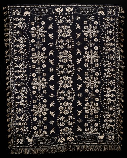 This Coverlet was produced in 1845 by Harry Tyler in New York, using resist-dyed cotton and showcases a dark blue ground with white motifs. During the early to mid-19th century, coverlets like these were more than just bed coverings; they were expressions of American identity. Mass production meant they were more widely available, reflecting a shift in domestic life and textile production. The coverlet’s imagery combines floral and geometric patterns with eagles, symbols deeply intertwined with the narrative of a young nation seeking to define itself. The choice to employ binary color combinations, creates striking contrasts and visual interest. The symmetry and order might evoke a desire for harmony and balance, which perhaps reflect the values and aspirations of the time. Looking at this coverlet, consider how everyday objects can carry stories of cultural identity, societal change, and personal expression, all woven into the fabric of our lives.