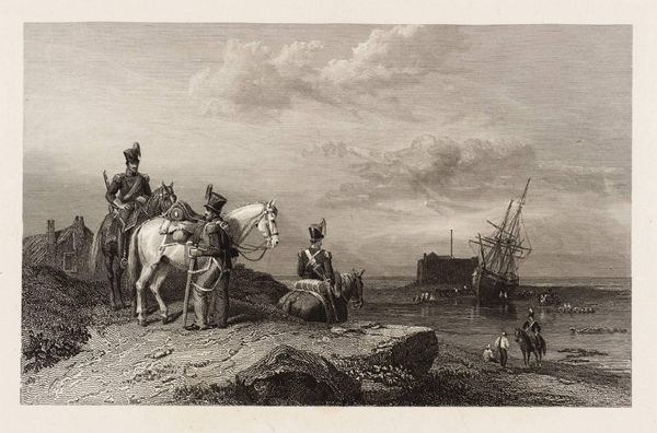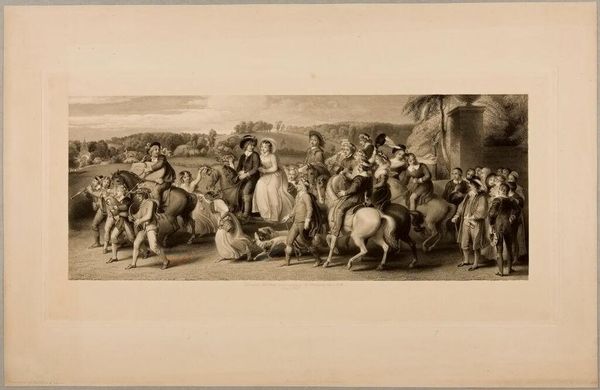 Curator: Here we have Zachée Prévost's print, "The Harvesters in the Pontine Marshes", held in the Harvard Art Museums' collection. Editor: It's striking. The figures seem caught between toil and some kind of strange celebration, a visual tension that really grabs you. Curator: Exactly, the composition organizes the figures into clear visual planes. Note how the artist uses tonal variation to create depth and focus. Editor: And those oxen! They're not just beasts of burden; they become symbolic of the brute labor demanded by the land itself. The materials used for the work and the tools carried are so interesting to examine. Curator: I'm drawn to the almost classical arrangement, the way the figures are posed evokes a sense of timeless narrative. Editor: But what about the social realities captured? The expressions, clothing, the very dirt seems palpable. Curator: Indeed, it shows us the universal themes of labor, celebration, and community. Editor: I see the hands of the worker reflected in the land, but you see an image of structured beauty. Fascinating.