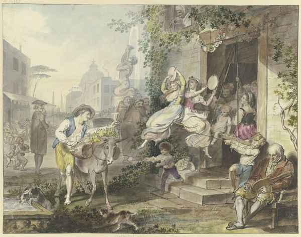 Friedrich Nerly created this scene of an Italian Terrace with Maidens and Lute Player using watercolor. This medium gives the artwork its delicate touch, highlighting the soft textures of the fabric and foliage, as well as the hard stone. The way Nerly uses watercolor is fascinating. He builds up the image in layers, starting with light washes and gradually adding darker tones to create depth and shadow. Look at the rendering of the lute player’s costume, for instance, and the drapery to the left, which are built with multiple layers of subtle color. This technique requires patience and skill, and it speaks to a tradition of meticulous craftsmanship. The setting of the piece emphasizes how the artist approached his work. Instead of a gritty, realist subject, we have a scene of leisure and beauty. It is important to remember that Nerly made this work for a market, and the time-intensive labor of watercolor was considered a luxury. The painting thus reflects both the culture that produced it and the economics that made it possible.
