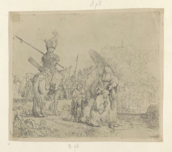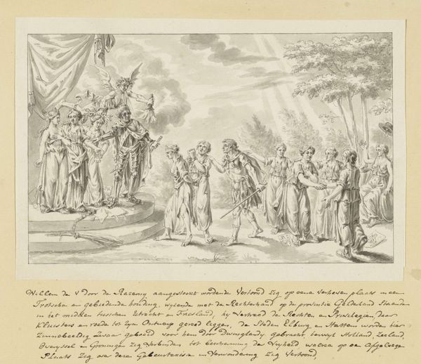 This drawing by Domenico Artaria captures a moment filled with movement, framed by delicate strokes of brown ink on paper. The eye is drawn to the detailed carriage at the center, its wheels and occupants rendered with meticulous precision. The composition invites us to consider the family members on foot, offering a farewell. Notice how the artist plays with scale and perspective, using the lines to create a sense of depth and emotional distance between those departing and those left behind. The architecture in the background is minimal, yet it provides a horizon that sets the stage for this intimate, familial scene. The use of a single color creates a sense of unity, allowing us to focus on the lines and forms that define the characters and setting. This aesthetic choice invites a semiotic interpretation, as each carefully placed stroke functions as a sign, contributing to a narrative about relationships, farewells, and the human experience. The drawing is not just a visual record but an exploration of human connection through its formal elements.