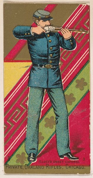 Curator: This is a print from 1888 created by the Kinney Tobacco Company as part of their Military Series, intended to promote Sweet Caporal Cigarettes. It's titled "Private, 2nd Veteran Corps, Philadelphia, Pennsylvania." Editor: Right away, I notice the graphic quality – very flat and stylized. The color palette is quite limited, mostly subdued greens, reds and blues against a tan ground. I am struck by the stark rigidity and geometry in the image. Curator: As a commercial print, it's interesting how they portray the figure. The veteran is dressed impeccably in his uniform, with what seems to be great attention to the detail of the buttons, cuffs and trim. I can feel this print taps into feelings of nostalgia and honor for veterans in the late 19th century. The figure exudes dignity and reserve in his expression. Editor: And it’s curious because, looking more closely, I observe this caricature-like exaggeration with his huge fuzzy hat and strangely elongated stance. There’s a flatness in the rendering of the face as well, that contributes to the sense that it could almost be a satirical representation of a veteran. There’s an oddly disjunctive formal relationship in his appearance. Curator: I wonder if this exaggeration might be playing into familiar, almost stereotypical, tropes associated with military figures at the time. This caricature approach may have actually reinforced certain cultural assumptions about veterans and what their service meant, contributing to the way the idea of ‘veteran’ was understood by the public, consciously or not. I would not discard the idea of "sweetness," also, when thinking of Caporal Cigarettes, perhaps referring back to the gentleness or inner nature of such figures of service. Editor: I find myself fixated on the way the patterned background clashes in this seemingly unresolved compositional space, giving it that tension that perhaps enhances its charm but also creates an imbalance, a disruption that is so evident. Curator: Despite its inherent flaws, I agree, its unique form is memorable, an attempt to immortalize a time. Editor: Yes, I walked in seeing just geometry, but this reveals some intriguing, complex ideas.