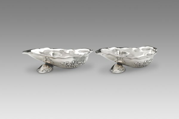 Curator: At first glance, these silver trays possess an almost austere elegance. There's a subdued grandeur that speaks of ritual and tradition. Editor: These gorgeous Baroque trays by Paul de Lamerie, crafted between 1739 and 1740, practically shimmer! I wonder what stories they could tell. There's an undeniably regal quality. Curator: Regal indeed. The symmetry, that very particular embellishment – it evokes abundance and ceremonial display. Editor: You know, the floral motifs running around the edges strike me as symbols of life and prosperity – perhaps for a noble family given the inclusion of their coat of arms? I can imagine them loaded with sweets. Did wealthy families pass these down? Curator: Likely heirlooms! The reflective silver would catch candlelight, imagine that in a baroque interior – shadows and shimmering surfaces designed to impress! Editor: Yes! I agree; it's such a delicious combination of simplicity and extravagance. Though, when I stare, my attention is always caught by the feet! Like miniature, sturdy animal paws anchoring these trays to reality, giving a grounded quality to the ornamentation. Curator: Good point! They become almost architectural elements, don’t they? Like a solid base supporting an elaborate design. De Lamerie clearly thought through the engineering; that they look like this after all these centuries proves this. Editor: What I appreciate is that this isn't mere functional art, these trays speak of dynasty! Curator: Ultimately, pieces like this 'Pair of trays’ are historical portals that still bring with them something fascinating. Editor: Well said! Pieces that are a testament to how our fascination with aesthetics, status, and continuity remain perennially intertwined.