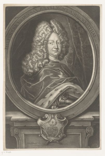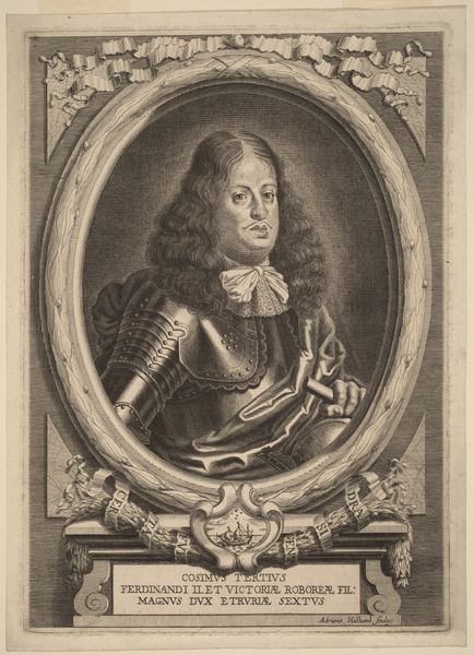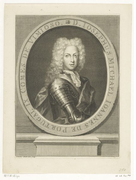 Editor: Here we have "Portrait of François I," made sometime between 1740 and 1750 by Gilles Jacques Petit. It's an etching and engraving. I'm immediately struck by the intricate detail of the armor and the way the artist has rendered the different textures. What can you tell me about the historical context in which this portrait was produced? Curator: Let’s look at that armor and how Petit renders it. It's not just decorative; it’s a symbol of power, crafted by skilled artisans. These kinds of portraits served a purpose: the circulation of status through printed material. Consider the economics, the workshop hierarchies, and the markets that these images fueled. How does that perspective change how you view this "Portrait"? Editor: That's interesting. I was so focused on the aesthetic details, I hadn't thought about the socioeconomic aspects. How the printing process democratized access to the image of the king while reinforcing hierarchies related to materials and access to labor. Do you think this challenges the definition of 'high art' in some way? Curator: Absolutely. It forces us to consider where we draw the lines. Is the skill of the engraver less valuable than the sitter in the portrait? The act of commissioning, printing, and circulating are important factors too. The printing press becomes a sort of factory, producing images in a way that aligns with broader shifts in 18th century labor practices. How does that influence how we understand power and representation at that time? Editor: I see what you mean! It makes me rethink the role of the artist and the value we place on different types of artistic labor. Thank you for pointing that out. Curator: Indeed! Looking at art this way provides rich insight on power and creation of history itself!