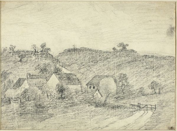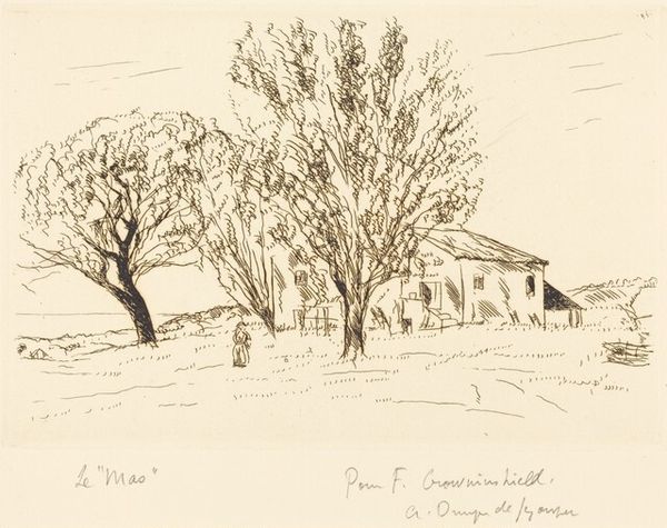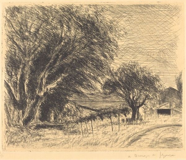 Curator: Andre Dunoyer de Segonzac’s 1937 etching, "Small Farm, Saint-Tropez", is before us—what's your first impression? Editor: The hatching creates a gentle rhythm across the paper, it has the stillness of midday on a hot day in late summer. It almost feels photographic in its realism. Curator: Absolutely, there's a kind of relaxed intimacy here. Segonzac, of course, was known for his landscapes, particularly his ability to capture the nuances of light, wasn't he? As an Intaglio print, its execution emphasizes line quality as a kind of shorthand, like quick gestures rendered in ink. Editor: Definitely. And consider that this is an etching: each line, carefully bitten into the metal, then inked and pressed. Think about the physical act, the labor, of producing that plate. It’s about more than just the depicted "landscape," isn't it? It becomes a study of process and materials, revealing the mechanics of artistic creation itself. Curator: I like the way you've put that. Beyond that, to me, Segonzac gets into that perfect emotional frequency with the landscape— the scene hums and breathes. Those distant mountains, that body of water in the distance and that farmhouse, like a stage set for something that might have been. It speaks to me, this idea of something deeply personal and profoundly universal—would you agree? Editor: Agreed. Plus, consider the implications. A limited-edition print elevates a scene of rural labor into an art object. Where does labor fit in this landscape? What do you make of the decision to immortalize this scene with this specific printing process? Does this transform a mundane, banal depiction of the local working population into an art object and investment? Curator: Perhaps. Art-making can have such slippery effects! All this said, I suppose one could even get into art and commerce itself! This work might even show me something different next time I see it. Editor: Precisely. I wonder what other kinds of conversation around production and class we can have with this etching in the future...
