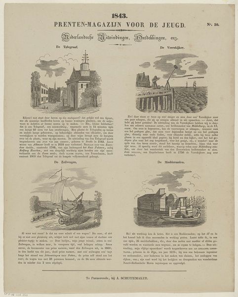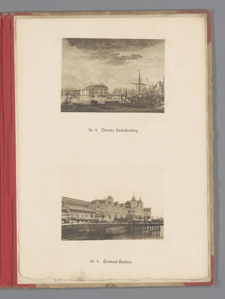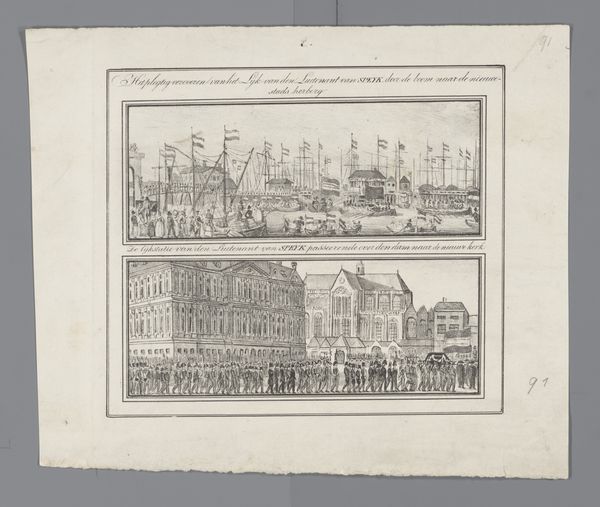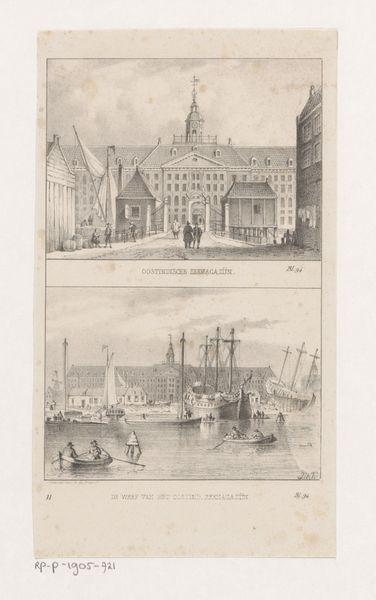 Editor: This is Jan Oortman’s print titled "Het oude stadhuis van Rotterdam / De kraan te Rotterdam", dating from 1833 to 1856. It's rendered with etching and ink, showing two Rotterdam scenes, each framed distinctly. The quaint portrayal really strikes me; what are your initial thoughts? Curator: Immediately, I'm drawn to how the composition contrasts the civic grandeur of the old city hall with the bustling port activity. Buildings rendered in yellows, but framed separately. This juxtaposition speaks volumes about Rotterdam’s identity being shaped both by established authority and commercial power, right? What do you see in the visual symbolism? Editor: I notice the crane is such a prominent figure, almost personified. Curator: Precisely. The crane as an architectural and functional element transforms into a visual emblem of trade. Think about it: Rotterdam literally rebuilding itself through maritime commerce! Also, consider the upward reaching spire against the gantry’s reaching arm - What’s evoked? Editor: Maybe aspiration and labour? One pointing to the heavens, the other physically moving the city's wealth? Curator: Yes, and note how the artist chose to depict them together. This wasn't just documentary; it’s about visually constructing the city's narrative of ambition and industry through symbolically loaded images for future inhabitants. How might cultural memory be formed here? Editor: The choice of scenes, especially how ordinary the crane image is, anchors the grand history in everyday life. Later generations looking at this would find meaning in the past. Thank you for pointing that out! Curator: My pleasure! Images really do contain layers and layers of memory and meaning.
