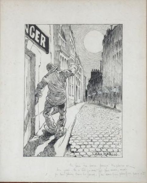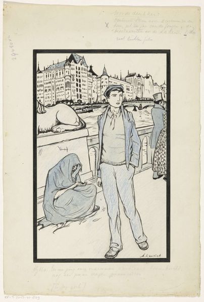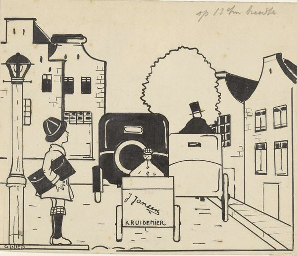 Anny Leusink made this drawing with pen, ink and pencil. The artist chose some quite modest materials to create this depiction of a man named Willem singing in a deserted village street. The drawing has been carefully constructed with clear, simple lines. With a clear attention to detail in the buildings, the artist has captured the atmosphere of a rural village, and imbued it with a sense of longing. The use of blue pencil to add depth and shadow to the monochromatic scene, is quite unusual. The lines are delicate, and the details are carefully rendered to produce an evocative image. The image is in the style of an illustration from a book. The choice of traditional drawing materials emphasizes a connection to the traditions of craft and illustration, while the subject matter reflects a social consciousness. Paying close attention to materials, making, and context, helps to appreciate the full meaning of this piece, challenging conventional separations between fine art and craft.