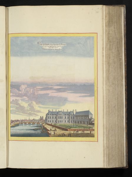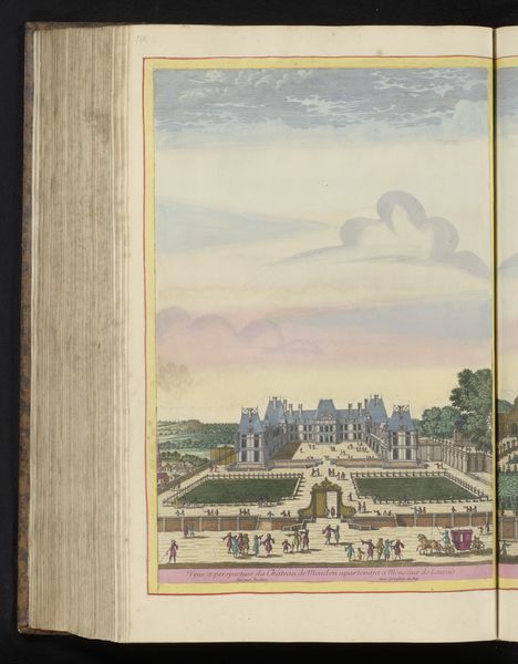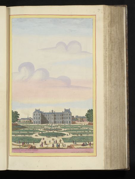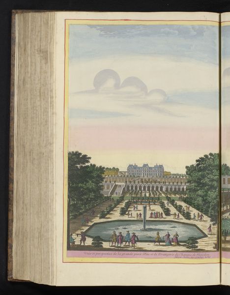 Curator: Well, look at this, it's like a dream dipped in ink! Editor: Precisely. What we're viewing is a print titled "Gezicht op Place Dauphine te Parijs" or "View of Place Dauphine in Paris," dating from 1685 to 1695. The artist is Aldert Meyer, and it's currently housed here at the Rijksmuseum. What strikes you most about it? Curator: Hmm... It's got that serene quality, like a faded memory. All the hustle and bustle rendered so delicate! It is as if each passer-by moves like a shadow under this pale sky. It makes you wonder what kind of lives did they live back then? Editor: Interesting, yes, you are noting the composition. Meyer employs a rather high vantage point. That allows him to articulate the spatial organization of the Place Dauphine through linear perspective. Also the use of color seems deliberately restrained, almost monochromatic save the few accents in pink and orange. That directs focus. The clouds are indeed stylized, they lack volume, yet evoke vastness. Curator: You're right, they do pull you back and out of the picture, like they are framing a deeper understanding of what this little area stands for. But tell me, what does this specific kind of artistic choice communicate at a societal level? Was this simply a rendering of Paris' beauties, or was Meyer speaking his mind? Editor: That’s a difficult thing to prove so many years later, right? One could hypothesize that through meticulous depiction of social spaces and their function, he participates in baroque's architectural glorification and the state control through visual design. One could even stretch the argument to suggest through this ordered representation he expresses admiration for established power. But you know, that is probably a stretch! Curator: Still, the very act of immortalizing a place, a moment, it has a certain intention. Art speaks whether the artist wants or not. The simplicity in color feels refreshing in this historical frame of overstatements and abundance. A quiet rebel of a painting. Editor: Maybe! Meyer gives us a lens—or better, a print—through which we can appreciate not just the Place Dauphine as an urban space but also a set of relations captured in ink. It really feels special. Curator: Absolutely! Thank you, Aldert Meyer. For this little Parisian poem.