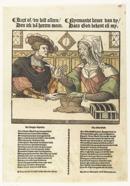 Cornelis Anthonisz. created this colored woodcut, "The Expulsion of Carelessness" at an unknown date. The print allegorizes the concept of "Sorgheloos," or Carelessness, through its violent expulsion from a domestic interior. It is a fascinating glimpse into the social values of the Dutch Renaissance. Produced during a time of religious and political upheaval, the print vividly captures anxieties about moral decline. "Sorgheloos" is assaulted by figures representing poverty, misery, and discord, suggesting the consequences of a life without virtue. What makes this work particularly compelling is its commentary on social structures. By associating "Carelessness" with chaos and suffering, Anthonisz. reinforces the importance of diligence and piety in maintaining social order. The text frames below each character add layers of meaning to the print’s narrative. To fully appreciate this image, one might consult contemporary texts on moral philosophy and social conduct from the 16th century, gaining insight into the cultural context that shaped Anthonisz.'s vision. The meaning of art resides not just in the image itself but in the network of social and institutional forces that brought it into being.