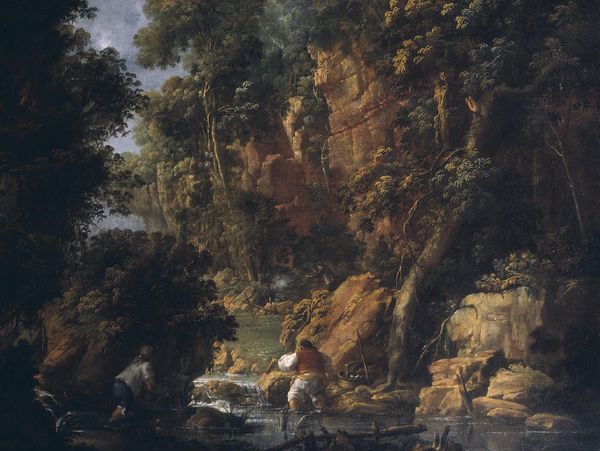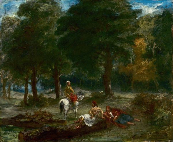 Editor: This painting, titled "Diane au bain," which I understand translates to "Diana Bathing," is attributed to Camille Corot and rendered in oil. It has a rather enigmatic atmosphere, almost dreamlike. The figures seem both present and lost within the landscape. What do you see in this piece, looking at it with your expertise? Curator: Immediately, I'm drawn to the symbolic weight carried by Diana herself. What emotional resonances do you perceive between the nude figures and the embrace of nature, here? Are they escaping or immersed in something, psychologically speaking? Editor: That's a great way to phrase it. To me, it's about immersion. They're surrendering to the landscape almost. Curator: Yes, exactly! Consider then that Diana is much more than a name in mythology; she's a powerful representation of untamed female virtue, existing in Romantic symbiosis with the natural world. This particular composition evokes earlier bath scenes, such as those created by Peter Paul Rubens, where a powerful Goddess unites herself to, and almost embodies, Nature. What aspects of this, do you think, Corot wishes to preserve, and which to transform? Editor: The idealized female form remains, but the surrounding wilderness seems less a backdrop and more of an active participant. Corot’s approach feels more… naturalistic in its details. Curator: Good. So what feelings does that elicit for a viewer today? Are we meant to yearn for such unity? Or critique the very idea of "untamed nature"? How has our own relationship with 'nature' shaped our modern view of the scene, as distinct from audiences who first viewed it in Corot's era? Editor: That’s fascinating to consider. I hadn’t really thought about how my own assumptions play into it. Thank you. Curator: And thank you. The continuing dialogue through art, like the landscape itself, transforms us both.