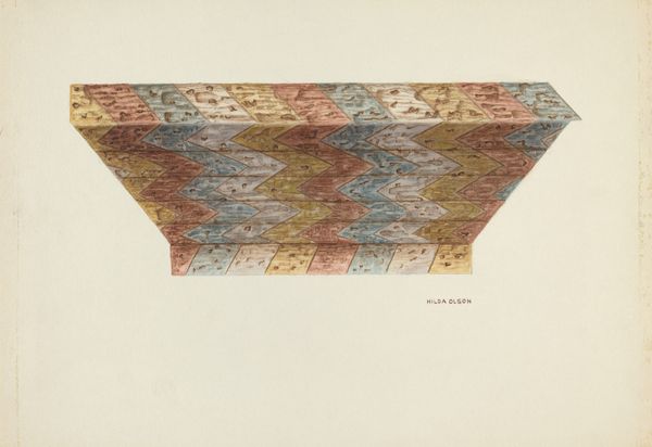 Editor: We’re looking at Margery Parish’s “Jerga (Carpet)” from around 1938, a watercolor drawing. It really plays with geometric abstraction, but it still gives this impression of textile work, like a woven surface. What can you tell me about it? Curator: This piece is fascinating because it blurs the lines between "high art" and craft. Parish uses watercolors to depict a "jerga," a type of rug traditionally made using weaving techniques. The choice of watercolor is itself telling – a medium often associated with studies or preparatory work is here employed to represent a finished textile. What does that suggest to you? Editor: Maybe that she’s trying to elevate a craft traditionally viewed as functional, something perhaps “lesser” than fine art. Was she involved with textile production in any way? Curator: Exactly! And that connection is vital. While Parish's paintings exist as independent works, considering the context of her access to textile production is very useful here. This allows us to analyze not just the visual composition but also the means of production that have brought this work to us, including who produces textiles, where, and how these products are then consumed. This is about labor, material, and how artistic practices are embedded in socioeconomic structures. Editor: So you're saying understanding the processes of carpet weaving, along with watercolor painting, are key to unlocking this piece? Curator: Precisely. The visual elements cannot be separated from the historical circumstances that made the production and consumption of this "carpet" possible. Think about the societal divisions embedded in art practices. By representing a carpet in watercolor, Parish directs our gaze to the construction, the materials, and therefore to labor itself. Editor: That completely changes my view! I was stuck on the geometric design, but now I’m thinking about the real-world object and its production. Curator: That’s the key: to think beyond the object on the wall, and see all that surrounds its making.