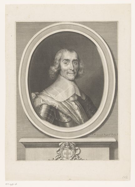 Robert Nanteuil created this engraving of Hardouin de Beaumont de Péréfixe, the Archbishop of Paris, using burin and etching techniques. Nanteuil worked during a time of strict social hierarchies, and portraiture was often used to reinforce the power and status of the elite. Consider the visual language employed here. The ornate frame and the subject's dignified pose are designed to convey authority. Péréfixe's vestments and the prominent cross speak to the power of the church in 17th-century France, yet his gaze seems to invite a more personal connection. Nanteuil, who was favored by the court, skillfully uses light and shadow to bring forth the archbishop's humanity. This engraving reflects a society deeply invested in image and representation. It encourages us to think about how identity is constructed and how art can both uphold and subtly question the status quo.