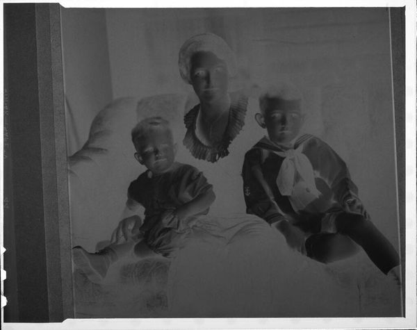 Editor: This is an untitled photograph by Martin Schweig. It seems to be a negative image of a mother and her three children. The reversal of tones creates a somewhat unsettling effect. What can you tell me about this work? Curator: The photograph's power lies in its challenge to conventional family portraiture. The inverted tones disrupt the expected presentation of domesticity, forcing us to question what "family" truly signifies, and for whom such idealized images are constructed. How does this disruption reflect societal anxieties around race, class, or gender? Editor: That's a thought-provoking question. So the image isn't just about a family, but about broader issues of representation? Curator: Precisely. By subverting the visual language of family photography, Schweig invites us to consider the unspoken power dynamics and societal expectations embedded within these seemingly innocent images. Understanding these contexts can make us more conscious viewers. Editor: I see. Thank you, I have a totally different perspective on family portraits now.