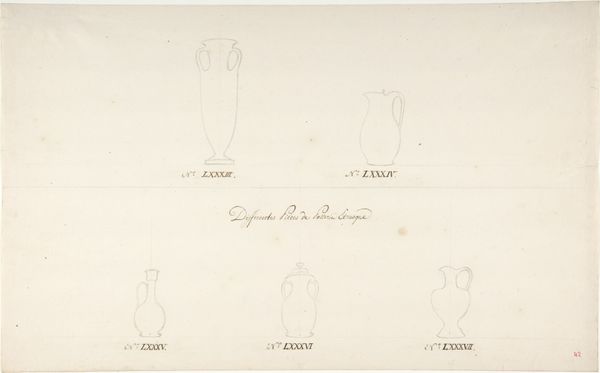 This drawing of three vase designs is rendered with graphite on paper. The anonymous artist presents a study in form and proportion, carefully delineating each vessel with delicate lines. The arrangement of these vases in a horizontal series invites a comparative analysis of their individual structures and the negative space between them. Each design showcases a variation on the classical vase form, employing a vocabulary of curves and straight lines, which suggests a dialogue between tradition and innovation. The subtle gradations in the graphite emphasize the play of light on the surfaces, hinting at the vases' potential materiality—perhaps glass or porcelain. The use of seriality creates a sense of rhythm and repetition, while the slight variations in form disrupt any rigid sense of symmetry. This hints at a broader exploration of the decorative arts, where function meets aesthetics. The drawing remains an exercise in design and a meditation on the fundamental elements of shape, line, and composition.