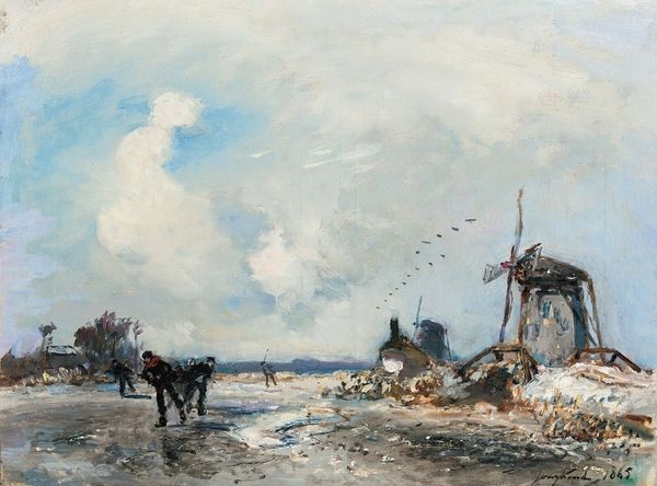 Editor: Here we have what's called "Salmon Fishery Village" by Albert Bierstadt. It’s…well, it's quite a scene. Ramshackle buildings, a stony beach, all rendered in a rather muted palette. There's a distinct sense of transience to it all, almost as if it could disappear at any moment. What catches your eye most about this piece? Curator: The "Salmon Fishery Village," as you say, seems almost spectral, doesn't it? The image seems washed over, recalling other images of impermanence that connect to collective cultural anxieties about survival. Look closely at the composition; do you notice how the temporary structures seem dwarfed by the expanse of the land and sky? Editor: Yes, now that you point it out, there's a kind of fragility. Like it's all clinging to the edge. Curator: Exactly! The imagery, deliberately or not, taps into deep-seated anxieties about human impact on nature, but also the reciprocal power of nature over human endeavors. Those muted colors amplify that feeling. Do you sense an implied narrative in the arrangement of the scene? Editor: Hmm, a narrative… Maybe of a community struggling to survive? Curator: Perhaps. The dwellings, their state of disrepair, combined with the human figures – what might they be suggesting about the relationship between humanity, labor, and the natural world in this context? What memories or historical narratives might this evoke for a viewer? Editor: I guess it makes me think about how fleeting human settlements can be and the precarity of life in harsh environments. It definitely challenges any romanticized view of the American West. Curator: Precisely. This image becomes a site where those cultural anxieties and historical realities converge, asking us to reconsider our place within the larger narrative of the world. Editor: That's given me a totally different perspective! It’s more than just a pretty landscape, it’s a mirror reflecting some hard truths.