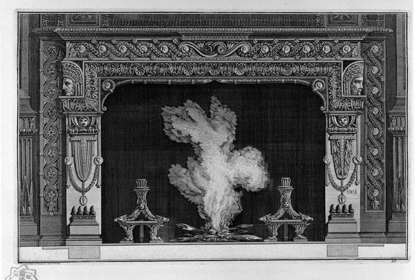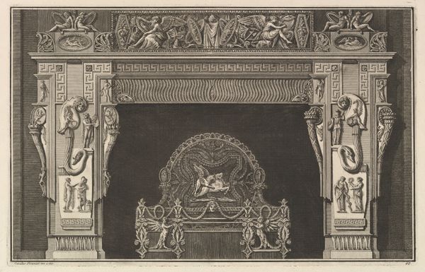 Giovanni Battista Piranesi created this fireplace design using etching, a printmaking technique dependent on skilled labor. The design’s aesthetic is defined by the incised lines, producing fine details and tonal variations. The making of etchings involves coating a metal plate with a waxy, acid-resistant substance, then drawing through this layer to expose the metal. Immersing the plate in acid bites away the exposed lines, which are then inked and printed. The result is a reverse impression of the design. This process, while technical, allowed for relatively easy reproduction and dissemination of Piranesi’s architectural fantasies. Note the historical context in which this design was produced. The elaborate ornamentation, classical motifs, and Egyptian-inspired details reflect the 18th-century fascination with antiquity. This fireplace speaks to both the artist's skill and the social milieu of elite taste and the labor of skilled artisans. It reminds us that even a seemingly straightforward print involves a complex intersection of materials, processes, and social values.