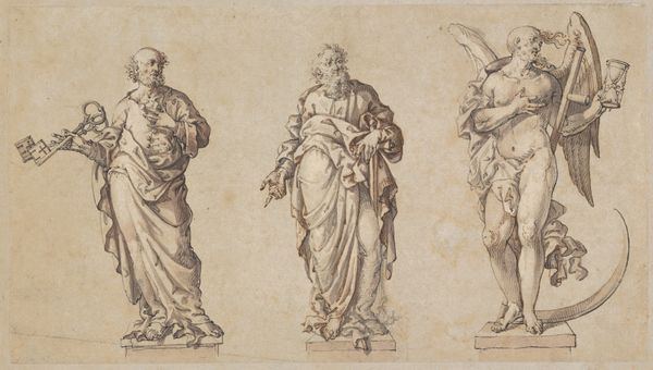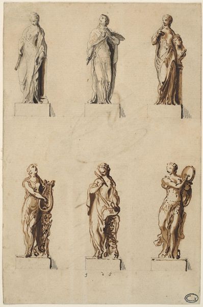 John Michael Rysbrack conceived this sketch for a funerary monument with pen and brown ink. The figures, draped in classical robes, embody the profound grief associated with loss. Consider the recurring motif of covering the face in mourning. From ancient Greek tragedies, where veiled figures lamented heroes, to countless depictions of the Virgin Mary grieving her son, this gesture transcends time. It signifies not only sorrow, but a turning inward, a retreat from the world’s harsh glare into the shadowed landscape of personal grief. Even today, this primal expression endures. Think of photographs from war zones or scenes of natural disasters, where survivors shield their faces, not just from the immediate horror, but from the future, forever altered by trauma. This instinctual act speaks to a collective memory of suffering, a deep-seated understanding of grief's isolating power. This image stirs within us a potent echo of shared human experience.