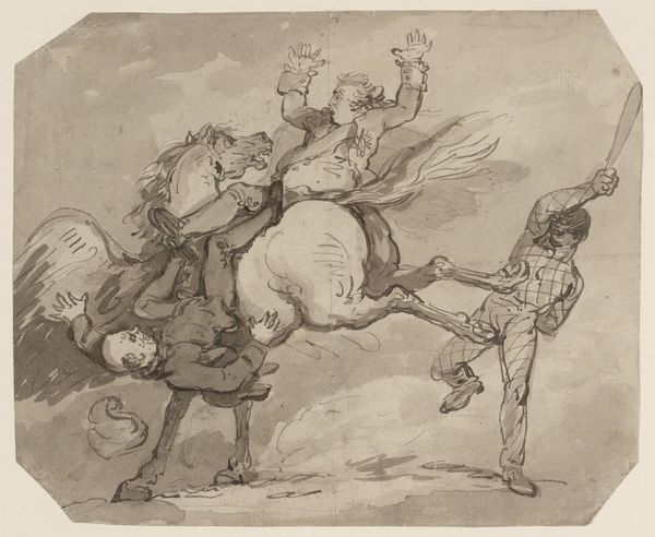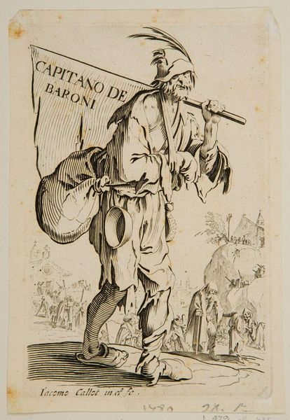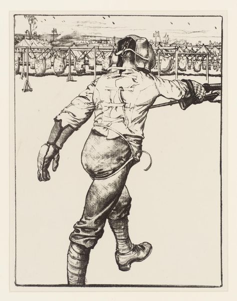 Editor: This etching, "The Drummer," created by Frank Wright in 1969, is quite striking. The scene is incredibly powerful, maybe even disturbing. What symbols jump out at you when you view it? Curator: The most resonant symbol here is, of course, the drummer himself. He’s a liminal figure – literally straddling life and death. Note how he strides powerfully forward, almost *over* the fallen. His drum and upward gaze become potent symbols of unwavering, perhaps even blind, devotion to duty. What emotional responses does the contrast between the living drummer and the fallen elicit in you? Editor: A sense of dissonance, definitely. The drummer's vigor clashes starkly with the stillness of those who’ve fallen. It makes me question the glorification of war. Curator: Precisely. Wright masterfully exploits this contrast. Consider, too, the recurring motif of the drum throughout history. Drums often represent the heartbeat, the pulse of a nation or army. Yet here, the heartbeat continues while others have stopped. It provokes a deep reflection on collective memory and how societies choose to memorialize conflict, wouldn't you agree? Editor: That makes perfect sense! It really makes you think about who gets remembered, and how. So, the drummer, although ostensibly a figure of hope and action, really becomes an indictment of sorts. Curator: Indeed. He becomes a complex symbol – simultaneously representing forward momentum and the potential obliviousness that allows such devastation to continue. The imagery compels us to contemplate the psychological weight carried by symbols and narratives perpetuated around warfare, generation after generation. What a poignant testament to enduring human themes. Editor: That really changes how I see the artwork! It’s not just a depiction of war, it’s a commentary on memory and how we perpetuate cycles. Thanks for clarifying those important aspects!