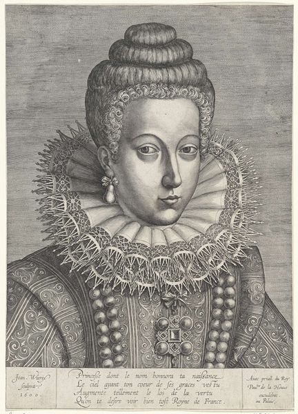 Editor: Here we have a portrait of Margaret of Austria, Queen of Spain, painted around 1600, likely in oil. I'm struck by her elaborate ruff and the ornate jewelry. It feels very formal, very much about projecting power. What symbols do you see embedded in this image? Curator: The symbols of status are certainly overt: the ruff, the jewels, even the very pale skin which denotes a life of leisure, untouched by the sun. But beyond that, consider the pearl. It adorns her ear, drawing our eye and whispering of purity, of wealth derived from the sea – a symbol as old as time itself. Look closer. The fabric patterns mimic heraldic designs. Editor: Heraldic designs as expressions of her lineage? Curator: Exactly. Think about the cultural weight each gem carries. Rubies suggest passion and protection, diamonds unbreakable strength and commitment. All of it communicates dynastic stability. Do you think it successfully achieves that communication, or is there a tension? Editor: Well, the way she averts her gaze slightly makes me think of an internal conflict between her role and who she might be personally. Perhaps her role doesn't allow her a "personal" at all. Curator: Indeed. Perhaps it's in the eyes, where individual psychology meets social expectations, that true meaning lies. So this painting gives the portrait meaning beyond representation of just the face. Editor: This has given me so much to think about when it comes to portraits, it is all there hiding in plain sight! Curator: Indeed! We see a young woman, but more than that, we are meant to see continuity, lineage, and the enduring power of an empire, expressed in a single gaze.
