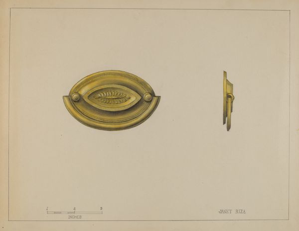 Editor: Here we have "Drawer Pull," a drawing rendered in pencil and watercolor by Janet Riza around 1936. What strikes me is how it elevates something so functional—almost mundane—into an object of beauty. What do you think makes this drawing stand out? Curator: Well, isn't it funny how we imbue even the smallest objects with meaning? Look at that eagle, centered there—such a simple, powerful symbol of America in the middle of the Depression era. Maybe Riza was thinking about hope, resilience, the little details that make a house a home even when things are tough. Do you get a sense of that? Editor: I do, definitely. The detailed rendering also gives it an almost aspirational quality, doesn't it? Like she's idealizing this one small part of a larger, more luxurious whole. Curator: Exactly! It makes you wonder about the bigger picture—literally. What kind of furniture did this drawer pull belong to? A grand desk, perhaps? Or something far more modest? Riza leaves that up to our imagination, focusing on this little jewel. It is almost sculptural. Editor: I see what you mean. So, it's less about the drawer pull itself and more about what it represents—or the stories we project onto it. Curator: Precisely. Think of all the hands that might have touched it, the secrets it guarded. That’s what whispers to me! Editor: I’ve never looked at a drawer pull and thought of secrets! That’s wonderful! Thank you. Curator: My pleasure, isn't it fabulous how art encourages us to really *see* things? To consider an item not as just an object, but rather as a symbol or storyteller?