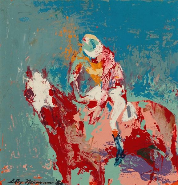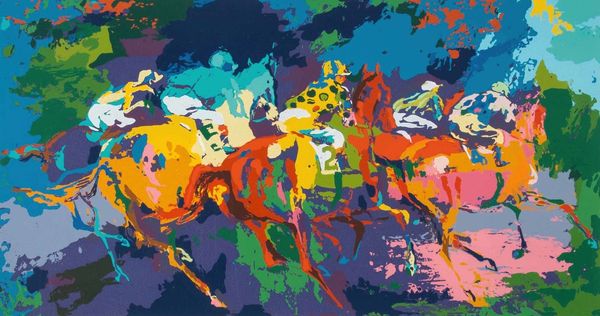 Curator: Standing before us, we have LeRoy Neiman’s *Into the Stretch*, executed in 1958 with acrylic on canvas. Editor: It practically vibrates with energy. The colors are so bold and applied with such force, it's hard not to feel swept up in the scene. I almost hear the thunder of hooves. Curator: Precisely. Neiman's application of color here transcends mere representation; it serves as a direct conduit for emotion. Note how he juxtaposes vibrant reds and blues, creating a visual tension that amplifies the sense of speed and competition. The visible brushstrokes are essential too, right? Editor: They are crucial. It reminds us that beyond this impression of movement and raw emotion is a consciousness, someone with intentions controlling the colors, guiding our eye. I'm also wondering about the historical context in which Neiman painted this. Horse racing, and by extension, paintings of horse racing, were for a long time the realm of high society, but this? Curator: Yes, the very *fact* of its expressionistic, gestural technique is what marks it apart. It’s 1958 and this breaks away from formal constraints, even societal ones linked to art patronage. By injecting abstract expressionist techniques, he democratizes the portrayal, channeling the raw visceral experience. The almost violent application of pigment rejects the placid depictions typically expected. Editor: And it's a democratization, too, of feeling. While earlier portrayals may have emphasized the elegance of the sport, Neiman is highlighting the sheer excitement, accessible to anyone. Thinking about public reception, would people feel challenged or energized by this abstract take on something so traditional? Curator: Likely both, Editor, likely both. Its radical stylistic departure forces the viewer to actively participate in constructing the image, dismantling passive consumption of art, one might say. Editor: In retrospect, Neiman's "Into the Stretch" seems more like an emotional record of an era of changing cultural touchstones than just an exciting horserace. Curator: Absolutely. By destabilizing visual expectations, he offered us a potent and subjective interpretation, breaking molds.