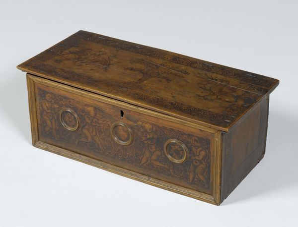 Editor: We're looking at a small bronze box, crafted by Severo Calzetta da Ravenna between 1525 and 1550. It’s incredibly detailed! I am immediately struck by the craftsmanship of this object; the details of the relief really pop. How would you analyze it? Curator: The object’s form asserts its conceptual significance. Note the composition of dense, intertwined figural reliefs; they deny the eye a resting place. The Mannerist style rejects the harmony of the High Renaissance. Editor: Can you expand on that idea of "rejecting harmony?" What exactly is being rejected? Curator: Consider the surface articulation; its ornamentation disrupts the box's basic geometric form. The tension arises from this deliberate interplay, between form and decoration. Ask yourself: how does the lack of visual clarity impact the viewer? The placement of the figures in the composition creates a claustrophobic feeling. Editor: I see what you mean. There's almost too much to look at, so it's hard to find a focal point, which departs significantly from what one expects from Renaissance art. This active, perhaps purposefully overwhelming, quality now gives the sculpture more intention. I also appreciate how you linked style to viewer experience, by commenting on that deliberate disruption of visual flow. Thank you! Curator: Indeed, observing that stylistic choice enhances our understanding. Considering those relations allows a better grasp on what we view, wouldn't you agree?