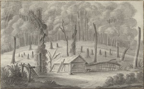 Curator: Brrr, it’s a bleak one. This scene has such a biting stillness to it, doesn't it? All in greyscale... a tonal drawing, the way the light catches on the snow drifts. Editor: You’re right, there's an immediate sense of isolation, almost a melancholic feeling. What can you tell us about this work? Curator: We're looking at a pencil drawing entitled "Winterlandschap," or "Winter Landscape," crafted by Johannes Jelgerhuis. Its dating is estimated between 1780 and 1836. What fascinates me most is the cyclical symbolism here. The skeletal trees reach upwards, echoing bare branches but implying a hidden potential for renewal. This image, devoid of color, emphasizes themes of resilience and transformation. Editor: And, I wonder, who were Jelgerhuis' intended audience for pieces such as this? The picturesque image, with its focus on labor and simple habitations, strikes me as participating in a vogue for a particular construction of rural life. It seems tailored to a certain bourgeois taste... Curator: Quite possibly. Note, however, the placement of those figures labouring, pulling the sledges of wood. There’s a definite visual and emotional emphasis on human perseverance against the backdrop of this harsh winter. Those laden branches can be seen as reflecting social constraints. Editor: Perhaps, but that to me also hints at a romanticized version of peasant life for those viewing it from a warmer interior. Look how much detail he dedicates to the rustic cottages, almost idealized in their construction against the unforgiving landscape. I see more a celebration of picturesque humility than an actual statement on societal structure, really. Curator: Perhaps a tension of both exists? Regardless, it serves as a potent reminder of winter's stark beauty. The scene is timeless and universally resonant; perhaps that speaks more broadly. Editor: Indeed. In many ways, this image reminds me of how cultural perceptions can shape and transform even the starkest realities. Curator: I agree. The symbols present offer continued perspectives of endurance in cycles. Editor: Well, thank you for bringing this intriguing piece to our attention.