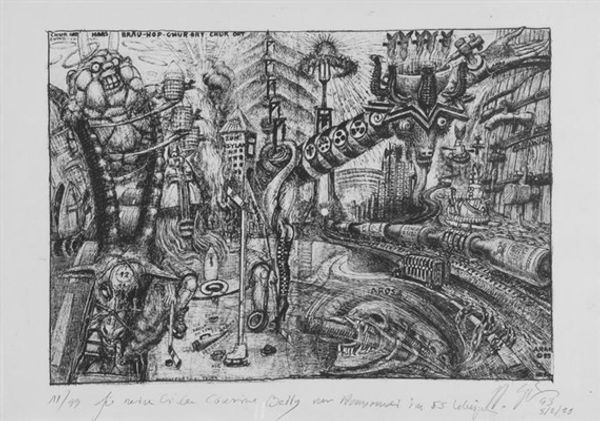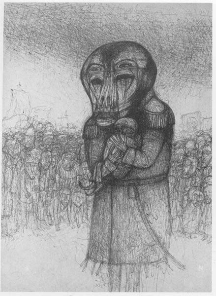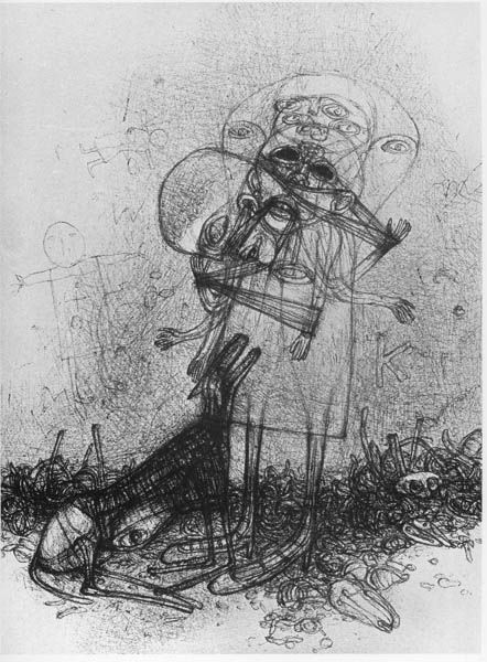 This unsettling, untitled work, created by Zdzislaw Beksinski, visualizes a landscape of grotesque figures rendered with stark precision. Beksinski's practice was deeply affected by his experiences growing up in Poland during World War II and later under Soviet rule, which instilled a sense of dread and anxiety that permeates his art. Here, a crowd of deformed faces presses in, while a central figure with multiple eyes seems both burdened and defiant. His works delve into themes of mortality and decay, influenced by the socio-political despair of his time. Beksinski once said he wished to paint "as if photographing dreams." There is also the sense of him giving form to collective trauma and personal anguish, a visual language of suffering and resilience.