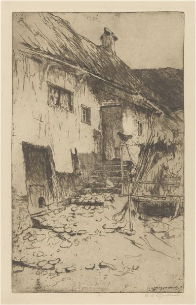 François Joseph Léo Drouyn created this etching, titled "Intérieur de Cour," capturing an interior courtyard. Drouyn was part of a movement that sought to document and preserve France's architectural heritage. This courtyard isn't just stones and mortar; it whispers stories of those who inhabited it, their daily lives etched into the very walls. The crumbling façade could speak to the socio-economic shifts occurring in France during the 19th century, as industrialization drew people away from rural areas. Drouyn’s work is a response to a changing cultural landscape, capturing moments of decay with the hope of preserving the past. What emotions does this space evoke? Perhaps a sense of melancholic beauty, a reminder of time's relentless passage, or a reflection on the silent witnesses that architecture becomes over generations. This image becomes more than a mere depiction; it’s an emotional landscape reflecting historical and personal narratives.