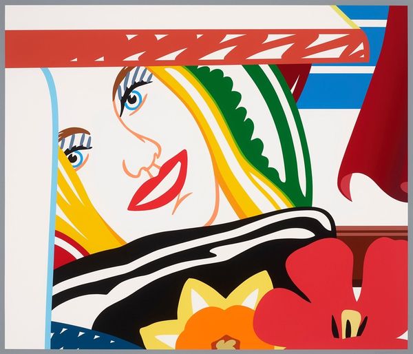 Curator: Oh, wow, that hits me right in my late-80s suburban teen heart! Talk about glamour, innocence, and, dare I say, a touch of wistful longing. Editor: You’re reacting, I presume, to "Bedroom Blonde with Iris," a 1987 acrylic on canvas created by Tom Wesselmann. Curator: I am! It's got that bold, flat color that’s just undeniably Pop. And that blonde! I bet she drove a convertible. Editor: It’s fascinating how Wesselmann pulls the tropes of advertising into fine art. He elevates the everyday, using simplification, clean lines, and striking colors to create these icons of American life. Curator: Absolutely. It’s so glossy it's almost sterile, yet something about the slightly sad eyes and the iris gives it a fragile humanity. Flowers always give tenderness in his oeuvre. Is that a fair reading? Editor: Flowers are classic symbols of beauty and fleeting life; and a commercial icon cannot have flaws, after all! I wonder about the male gaze though. It is like a passive, posed female presence in this constructed bedroom tableau. Curator: Ah, see, I almost bristle at that. The “gaze” idea feels overdone to me these days. I look at this woman, and I feel empathy. And maybe even… a little bit of boredom? Like she’s in a fancy magazine ad, but inside, she's craving something real. Perhaps a rebellion against such constructed roles. Editor: I take your point about empathy. The irises certainly introduce vulnerability, undercutting the slick perfection. We see this pop style often flattened human figures into objects, losing emotion for the sake of a clear, mass-producible image. Curator: Exactly. It's that tension between the slick surface and the emotional undercurrent that makes it sing to me. He understood the contradictions of our culture: desire, aspiration, the impossible pursuit of beauty. It can break you or empower you, I guess. Editor: Well said! Wesselmann gives us much to ponder—the evolving nature of art and femininity within an image-saturated culture. Curator: I leave wanting to write a short story or at least binge watch some period movies now, so yeah. Editor: For me it is considering who defines such "aspirational" states and toward what ends... Intriguing, really, how the same image sparks such divergent pathways.