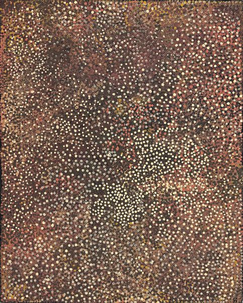 Editor: This is Emily Kame Kngwarreye’s "Anatye: Bush Potato," painted in 1989 using acrylics. I'm struck by the sheer density of the dot work. It almost vibrates! How would you interpret this work? Curator: Well, consider the material's origins and how Kngwarreye engaged with them. Acrylic paint, a relatively modern substance, was used here by an Indigenous artist. Doesn’t that intersection of modernity and tradition pique your interest? How does it sit with the subject matter of the bush potato, a staple food? Editor: I hadn't really thought about acrylic *itself* having a history, let alone its use in indigenous artmaking. Curator: Exactly! This is more than just a pretty pattern. What about the canvas as a manufactured surface? Think about its availability, cost, and distribution within the art market. How does that frame Kngwarreye’s labour in relation to Western consumption? Editor: So you're saying the painting's value isn't just in the image but in understanding the labor, the canvas production, the acrylic's industrial origin? Curator: Precisely. The dots might represent the potato, but they also signify labor. Thousands upon thousands of individually applied marks. Look closely, and you see slight variations in pressure and consistency. Each a small record of the artist's hand and its movement. Editor: This completely reframes my view. It’s not just a representation; it’s about the making of. I see a commentary on materiality now. Curator: Yes, we must be critical of what materials and means are being used and why. It changes how we interpret the whole piece.