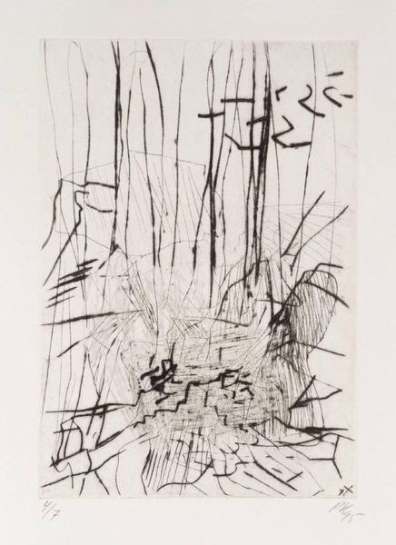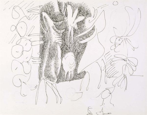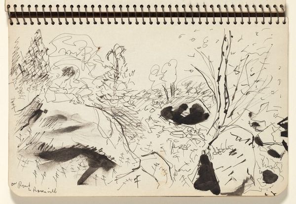 Editor: Here we have "Virágok" by Czóbel Béla, created around 1956, it's an ink drawing. The immediate feeling I get is of frenetic energy, a burst of floral chaos captured with incredible speed. What’s your take on this piece? Curator: It's like walking through a garden where every bloom is shouting for attention, isn't it? Czóbel’s lines are beautifully raw. To me, it feels like he's not just drawing flowers, but the very *idea* of flowers, their ephemeral nature. See how the pen almost dances across the paper? It’s less about precise botanical detail and more about feeling the vitality of nature. Do you sense that frantic beauty? Editor: Definitely, almost like he’s trying to capture a memory before it fades. I’m intrigued by the lack of distinct forms though; it feels almost abstract at first glance. Curator: Precisely! And consider that this was made during a time of great social and political upheaval in Hungary. Maybe these aren't just flowers; perhaps they symbolize resilience, the persistence of beauty even in turbulent times? Perhaps it’s a garden that exists solely in the mind. A rebellion in ink, what do you reckon? Editor: That’s a beautiful way to see it. So it is more than just a fleeting impression, it's Czóbel grappling with something deeper through nature? Curator: I'd say so. Art is not simply imitation of nature. Czobel’s 'Flowers' offers us an opportunity to reflect on life’s energy itself, how beautiful that may come out messy sometimes! Editor: That definitely gives me a fresh perspective on sketchbook art. I am left looking beyond its apparent disorder into a deeper expressive meaning!