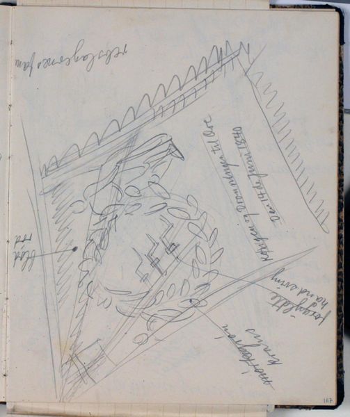 Editor: We're looking at "Studier af bygninger. Notater," or "Studies of Buildings. Notes," a drawing in pen and pencil by Niels Larsen Stevns, dating from between 1930 and 1936. It's…sketchy, obviously! And yet, there’s something quite captivating in its simplicity. What do you see in this piece, that I might be missing? Curator: It feels like a whispered secret, doesn’t it? Not a grand statement, but a quiet observation. I love the immediacy of it; like the artist just pulled out a notebook and captured a fleeting moment, almost like a visual diary entry, you know. And the little handwritten notes scattered around – "red tiles, fairly green," – it makes the experience more intimate. It reminds us that even buildings have their colours shift with the light. How interesting is that? It is such a modernist moment! Editor: It's true; it does feel like we are looking at his personal notebook. It is curious to notice, how there is the name of colors as if he was deciding what tone to choose. Almost as a painterly act, I see. Curator: Precisely. It's not just about recording the structure; it is also about feeling and conveying the experience. Stevns’ landscape studies often captured the essence of Danish scenery. This work, it seems like Stevns has found the sublime even in everyday architecture. Have you looked at how this ordinary sight is composed? The perspective from the roofs' corner? I see something that has been done later on, on a street scene in London... Editor: Now that you point it out, that low angle and looking at the roofs in the foreground makes it less about the objective buildings, and more of how the body relates with a building space. Something interesting that has something intimate, don’t you agree? Thanks for pointing that out, I will have that in mind. Curator: I enjoyed noticing it with you, truly! It’s these layers of intent and observations that elevate simple sketches into something so compelling.