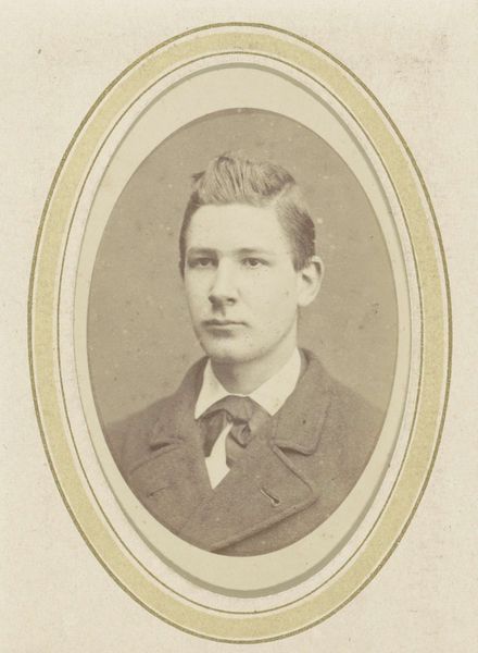 Editor: Here we have an untitled photograph by George Kendall Warren, housed at the Harvard Art Museums. The oval shape and sepia tones lend it a timeless, almost ghostly quality. What strikes you about its formal construction? Curator: The stark contrast between the subject and the background creates a visual tension. Note how the limited tonal range and the soft focus draw attention to the sitter’s gaze, inviting a semiotic reading of character through physiognomy. Editor: So, the composition itself is making an argument about the sitter? Curator: Precisely. The artist’s manipulation of light and shadow, within the constraints of the photographic medium, infuses the portrait with symbolic weight, regardless of the sitter’s identity. Have we uncovered something about photographic portraiture? Editor: Definitely. I now see how much the photographer can manipulate our reading of a subject, even without knowing who they are.