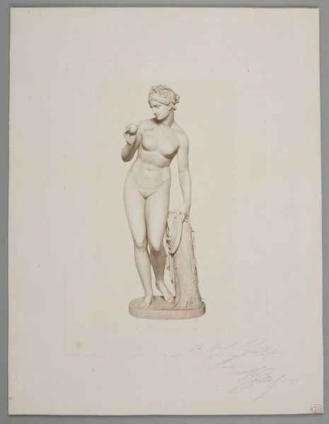 Curator: Let’s consider "The Toilet," an engraving by W.H. Mote, now residing in the Harvard Art Museums. What strikes you upon first viewing it? Editor: The cool, almost frigid, palette immediately catches the eye. The subtle gradations of grey and white give the figure a sculptural quality, cold but refined. Curator: The image shows a female figure, likely a goddess, in the act of preparing herself. The title "Toilet" suggests a ritual of self-care, a moment of transformation laden with cultural significance. Editor: The linear precision is compelling, particularly the draping fabric across her lower body. The artist employs a delicate hatching technique to create a sense of depth. Curator: Indeed. The act of "toiletry" itself has long been associated with power and status, think of Egyptian queens preparing for their reign. This image taps into those deep symbolic roots. Editor: I concede to your points, it all does seem very well-thought-out, it is well put together. Curator: The symbolic load here is quite heavy. Editor: Agreed, I will be thinking about this piece later.